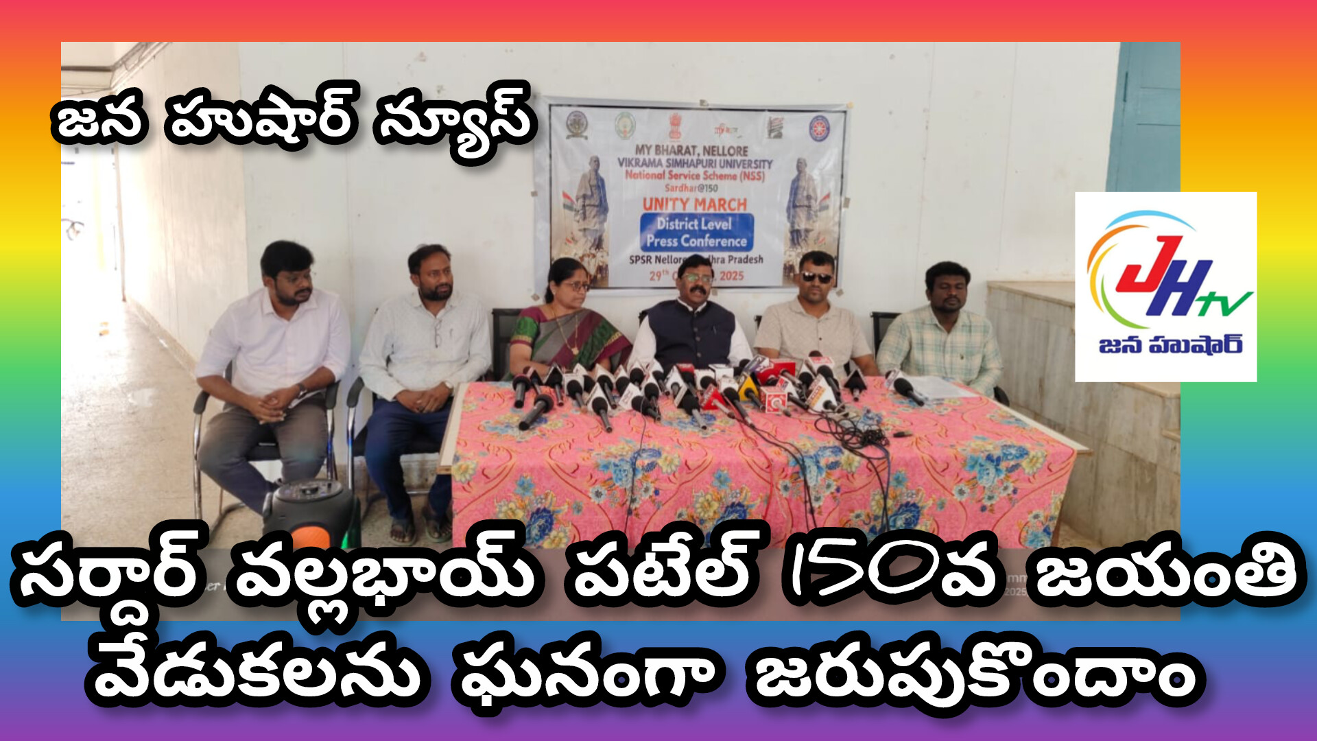 భారత దేశపు ఉక్కు మనిషి సర్దార్ వల్లభాయ్ పటేల్ 150వ జయంతి వేడుకలను జిల్లాలో ఘనంగా నిర్వహించాలని విక్రమ సింహపురి యూనివర్సిటీ (వీఎస్యూ) వైస్ చాన్సలర్ ఆచార్య అల్లం శ్రీనివాసరావు పిలుపునిచ్చారు. ఈ వేడుకల్లో ప్రజలందరూ భాగస్వాములు కావాలని ఆయన విజ్ఞప్తి చేశారు. ‘మేర యువ భారత్’ ఆధ్వర్యంలో బుధవారం నెల్లూరు నగరంలోని కస్తూర్బా కళాక్షేత్రంలో విలేకరుల సమావేశం నిర్వహించారు. ఈ కార్యక్రమానికి వీసీ ఆచార్య అల్లం శ్రీనివాసరావు ముఖ్య అతిథిగా హాజరయ్యారు.